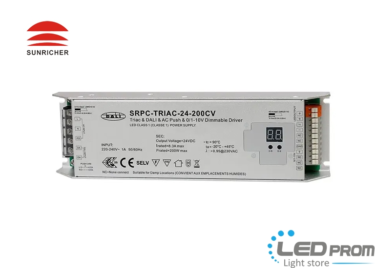 SRPC-TRIAC-24-100CV — схвалений ENEC симісторний світлодіодний драйвер потужністю 100 Вт з регульованою яскравістю та 1 -канальним виходом постійної напруги 24 В постійного струму. Він розроблений з входом 200-240 В змінного струму і повністю ізольованим металевим корпусом. Драйвер димування симістора розроблений з інтерфейсами DALI, Push, Triac, 0/1-10V 4 димування в 1, що дозволяє йому працювати з різними системами управління. Цифрове затемнення з ШІМ забезпечує плавне затемнення до 1% без мерехтіння та шуму. Коефіцієнт потужності драйвера може бути більше 0,9, а ККД вище 91%. 1 адреса DALI може бути автоматично призначена майстрами DALI. Відповідно до IEC 62386-101, IEC 62386-102, IEC 62386-207 цей драйвер DALI сумісний з більшістю систем DALI на ринку. Димований драйвер Triac LED 24V може бути сумісний з універсальними димерами Triac. При виборі інтерфейсу 0/1-10В він сумісний з універсальними димерами 0/1-10В.