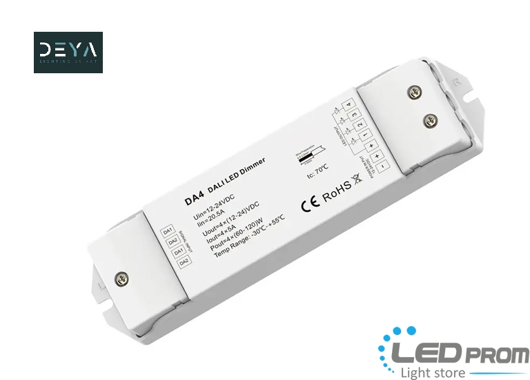 4-канальний світлодіодний диммер постійної напруги DALI, 5 А на канал. 4 адреси DALI, 4 канали працюють окремо.