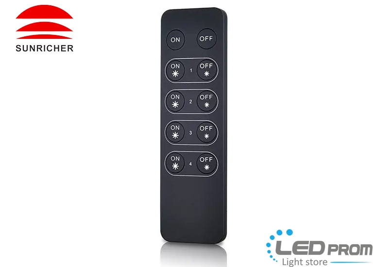 Пульт SUNRICHER SR-2833K4 10-кнопковий 4-зонний пульт керування (RF) для контролерів серії SR-1009 з регулювання яскравості в діапазоні затемнення від 0,1 до 100%.