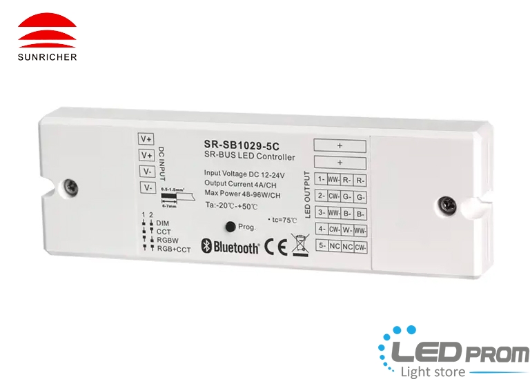 Драйвер світлодіода Bluetooth розроблений з інтерфейсом керування Bluetooth та RF, а також з гнучкими варіантами керування, включаючи програму Bluetooth, дистанційне керування RF. Крім того, хмарне керування готове для світлодіодного контролера, який забезпечує віддалений доступ. Завдяки хмарі вона може спілкуватися та працювати з основними популярними платформами розумного будинку, такими як Amazon Alexa, Google Assistant та Yandex Alisa, які дозволяють користувачам керувати ним за допомогою голосових команд та звільняють руки. Він розроблений з входом постійного струму 12-24 В та 5-канальним виходом постійної напруги, макс. вихідний струм може бути до 4А, що означає загальну потужність до 480Вт. Ключова особливість