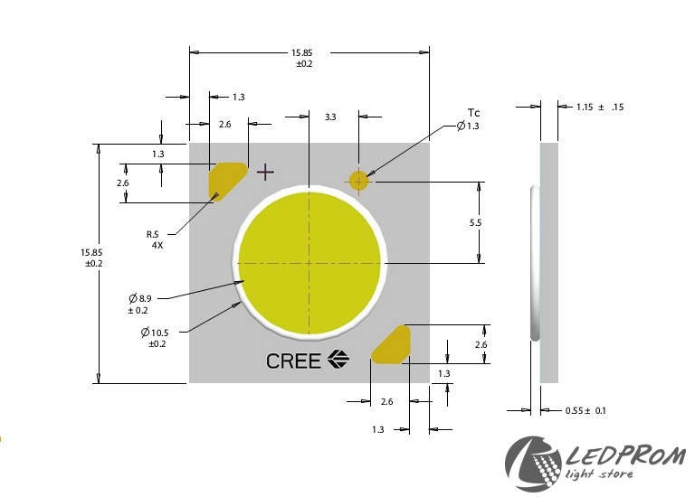 У цього потужного світлодіода з підкладкою характеристики потужності – 15Вт, світлового потоку – від 700 до 1300Лм, кольором світіння є білий.