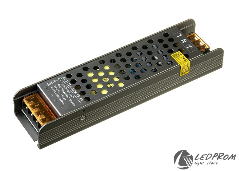 AVT 150-12V - voltage stabilized power supply. It is mainly used for connecting LED strip. It is a budget power supply in a metal perforated case. Has a number of protection against short circuit, overload and overvoltage. It has a relatively small size.