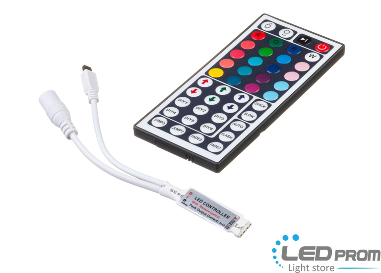 The provided controller contains three channels - red (R), green (G), blue (B). Such a product, with programs loaded into memory, is called an RGB controller. It is needed to drive RGB LED products, so it connects to RGB LED strip and diode fixtures or RGB LED modules. Power is supplied to the controller from a stabilized 12V power supply.