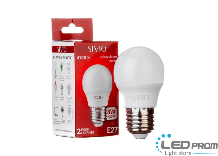 The G-45 8W SIVIO LED lamp is a modern replacement for outdated incandescent and fluorescent lamps. The energy consumption of this lamp is approximately 10 times less than that of an alternative incandescent lamp. Also, the LED lamp does not contain mercury and other harmful substances, which means it does not require disposal. This lamp has surge protection. It also has a special driver that prevents flickering of the lamp and protects the eyes from excessive flickering.