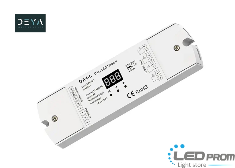 4-канальный светодиодный диммер постоянного напряжения DALI с цифровым дисплеем, 5 А на канал. 1-4 количество адресов DALI выбирается, 4 канала работают отдельно.