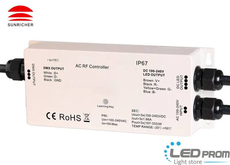 Новый водонепроницаемый высоковольтный радиочастотный контроллер переменного тока SR-1009HT(WP) - это отличное новшество, разработанное с широким входом 100-240 В переменного тока и выходом 100-240 В постоянного тока, класс водонепроницаемости IP67 для управления светодиодными лентами RGB высокого напряжения для внутренних и наружных крупных проектов, которые имеют строгие требования к водонепроницаемости.