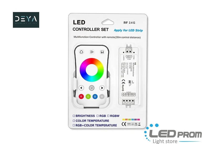 DEYA DR8-1+DV3 - контроллер с пультом в комплекте. Пульт DEYA DR8-1 - 1-зонный пульт управления (RF). 2.4Ghz беспроводной технологии, дистанционное расстояние до 30 м. Применяется к контроллеру светодиодов RGB или RGBW, диммирующему драйверу или умной лампе. Сверхчувствительное сенсорное колесо регулировки цвета. Один контроллер RF принимает до 10 пультов дистанционного управления.