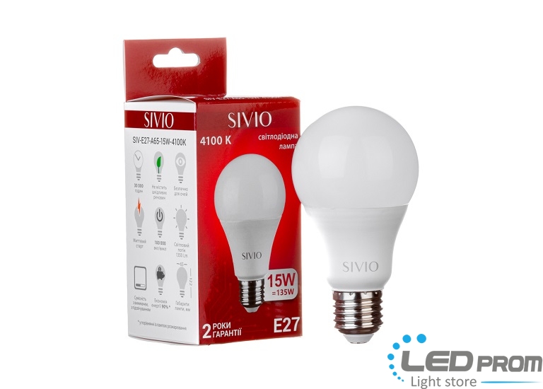 Светодиодная лампа A-65 15W SIVIO является современной заменой устаревшим лампам накаливания и люминесцентным лампам. Энергопотребления данной лампы примерно в 10 раз меньше чем альтернативной лампы накаливания. Так же светодиодные лампы не содержат ртути, а значит не требуют утилизации. Так же на данной лампе установлена защита от скачков напряжения. На лампе присутствует специальный драйвер который предотвращает мерцания лампы и защищает глаза от излишнего мерцания